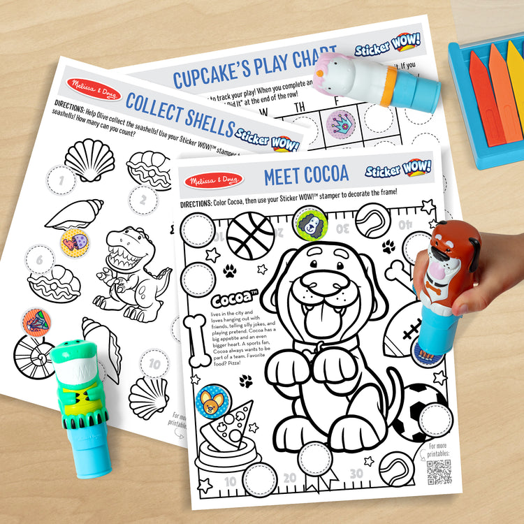 The Sticker WOW!™ Dog Bundle lets kids play with stickers in a whole new way. Using Cocoa the Dog — a cute, collectible sticker stamper — kids can stamp pets‑themed stickers onto a 24‑page activity pad, a bonus 24‑page mini activity pad, and creative art projects. With 500 total stickers, kids enjoy satisfying fidget‑friendly stamping while practicing counting, matching, and search‑and‑find skills through engaging pet‑themed activities.