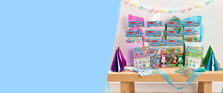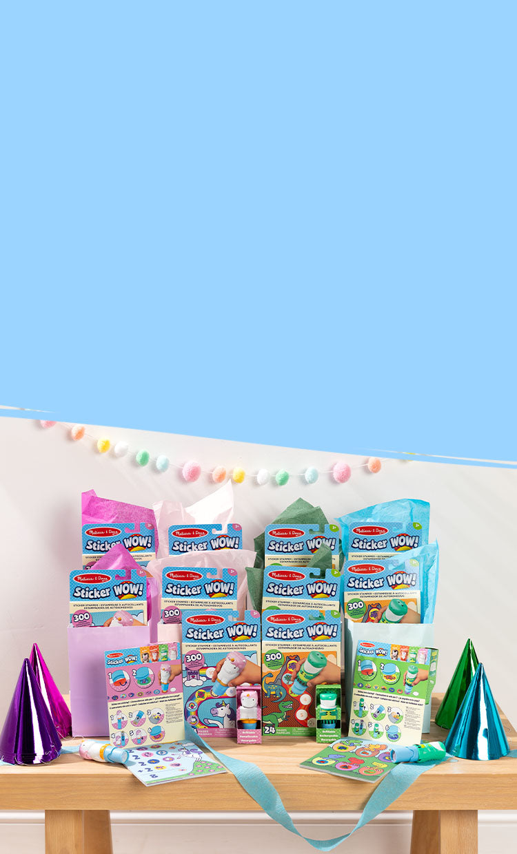 A MelissaAndDoug.com Exclusive! Pick out a 12-pack of our popular StickerWOW! Activity Pads and Stampers in your kid’s favorite theme. Great for goody bags and as a party activity!